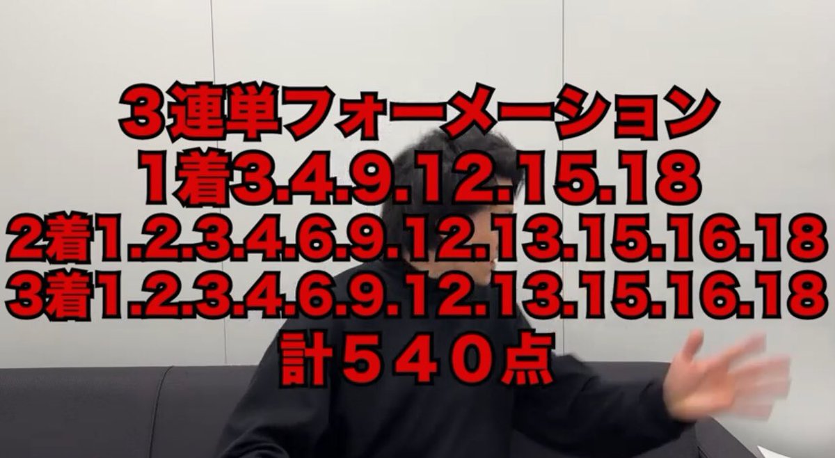 3連単 ③④⑨⑫⑮⑱→①②③④⑥⑨⑫⑬⑮⑯⑱→①②③④⑥⑨⑫⑬⑮⑯⑱ 計540点